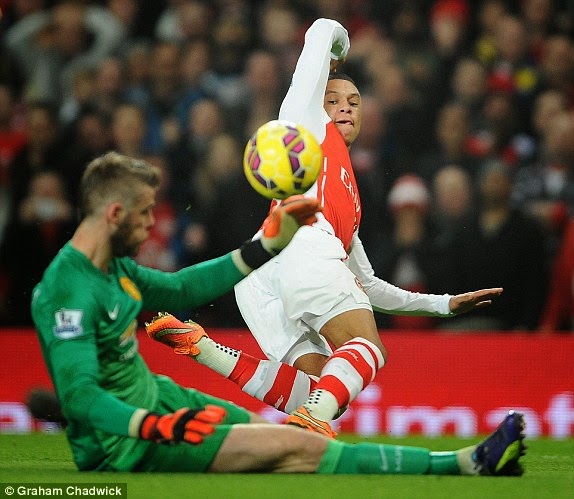 It was great to see Fellaini not react to Wilshire’s deliberate attempt to wind him up, in fact Wilshire should have at least been given a yellow for headbutting Fellaini’s navel. Di Maria, Rooney and van Persie were given the task of helping out defend and look for the chance on the counter attack. As expected Arsenal, playing at home, spent the first half attacking, but like other opponents this season they couldn’t find a way past the ever impressive United keeper David De Gea.