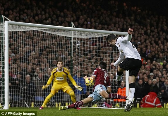 Home keeper Adrian saved with his feet from a van Persie effort when, as with Falcao the Dutchman should have done better in a goalscoring position. This was immediately followed by a caution for Luke Shaw as he stopped a break from the home side.