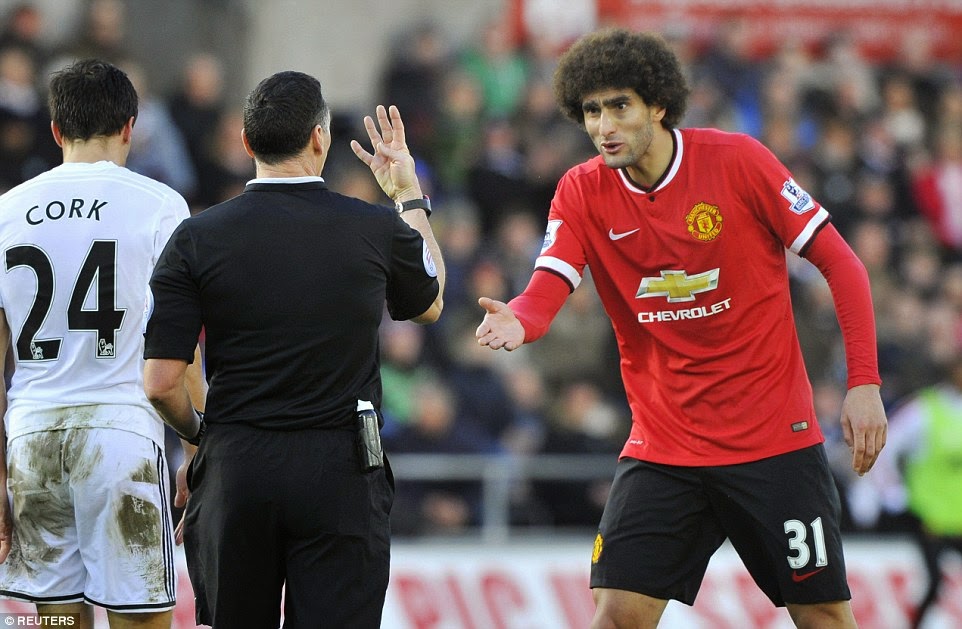 Referee Neil Swarbrick eventually lost his patience with Fellaini, who finally received his yellow card after having conceded four free-kicks.