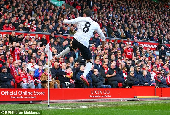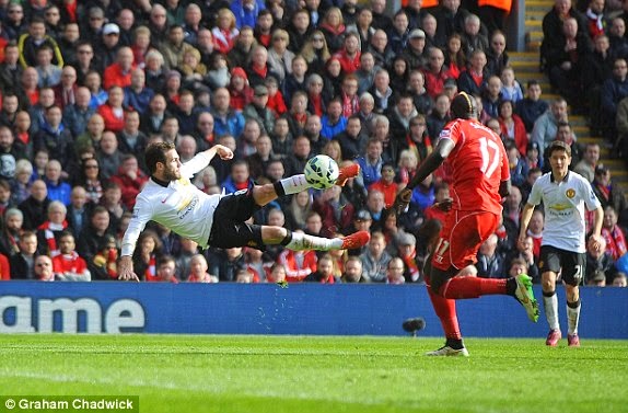 It happened in the 13th minute following approach play by Fellaini who fed an inside pass to Herrera who in turn saw the run of his compatriot and slipped the ball perfectly through to Mata who finished comfortably with a right-footed shot across Mignolet and into the far side of the net. What a strike and a great start for United and fully deserved.