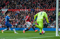 De Gea produced a moment of deja vu after his heroics last season in the same match with a save on the line from a goal bound effort from that man Jagielka again. During this period, Everton enjoyed their best spell of the game and United had to be alert to the danger.